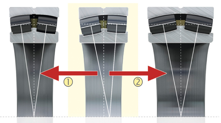 La disposition asymétrique des rangées des éléments roulants avec différents angles de contact tient compte de leur charge variable dans les éoliennes. En fonctionnant normalement, les forces agissent principalement dans un sens sur la rangée d’éléments roulants soumise aux charges axiales. C’est pourquoi l’angle de contact est plus important. Ce concept accroît la robustesse des roulements tout en réduisant les températures, les pertes par frottement et la consommation de lubrifiant. La durée d’utilisation des roulements augmente ainsi considérablement.